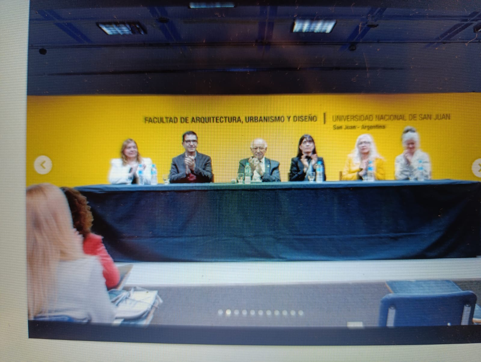 De izquierda a derecha : Diectora del Instituto de Teoría, Historia y Critica del Diseño Nello Raffoy Coordinora Nodo San Juan RAP, Mgst. Ma. Cristina Monfort – Decano FADU UNSJ. Carlos Herrera – Rector UNSJ Mag. Ing. TADEO BERENGUER – Vice Rectora Dra. ANALÍA PONCE, Presidente Red Argentina del Paisaje Mgst. Maria Isabel Pèrez Molina – Representate técnica Obs.yLAb. Paisaje cultural de los Valles Andinos Centrales Dra. Arq. Lorena Mancini Marchesi
